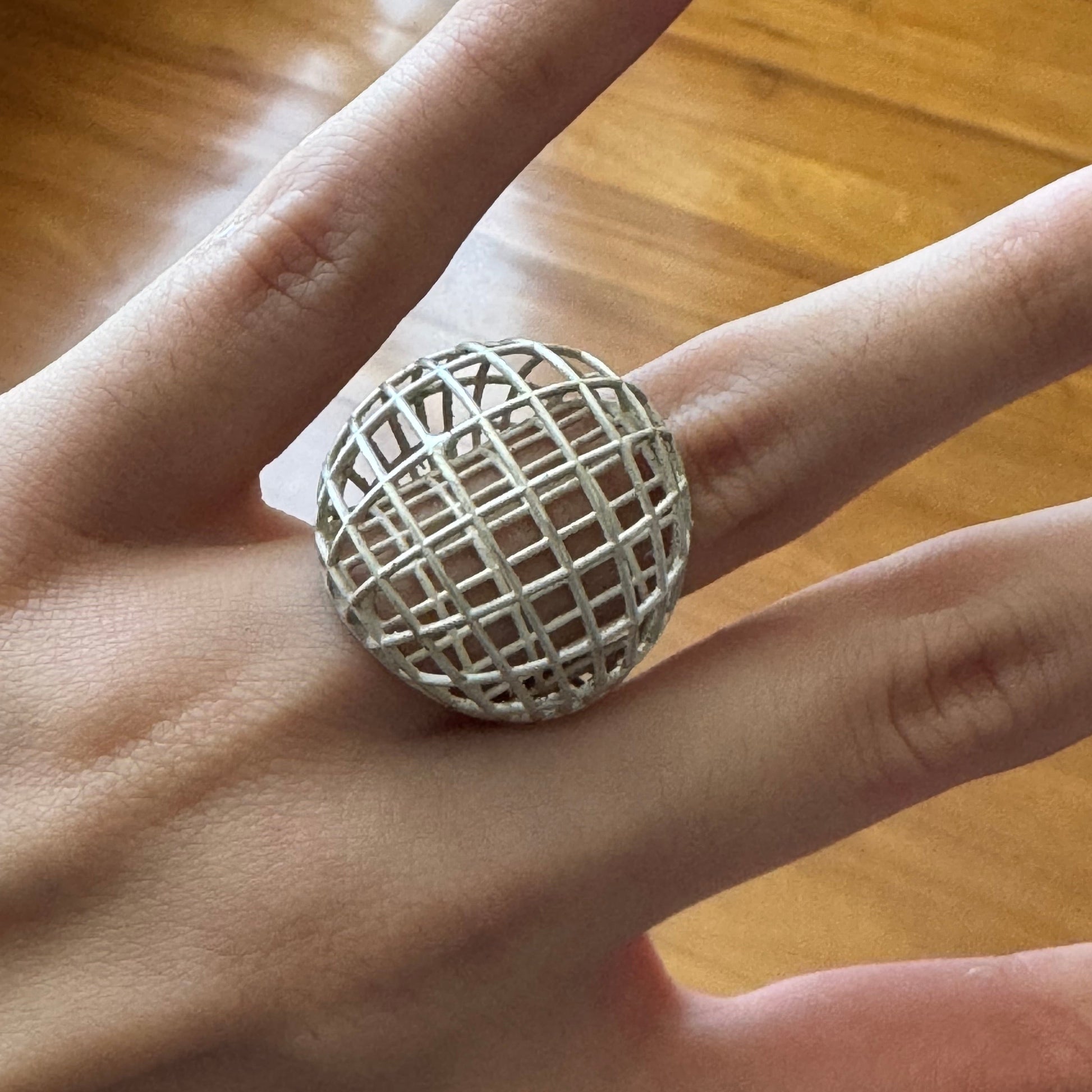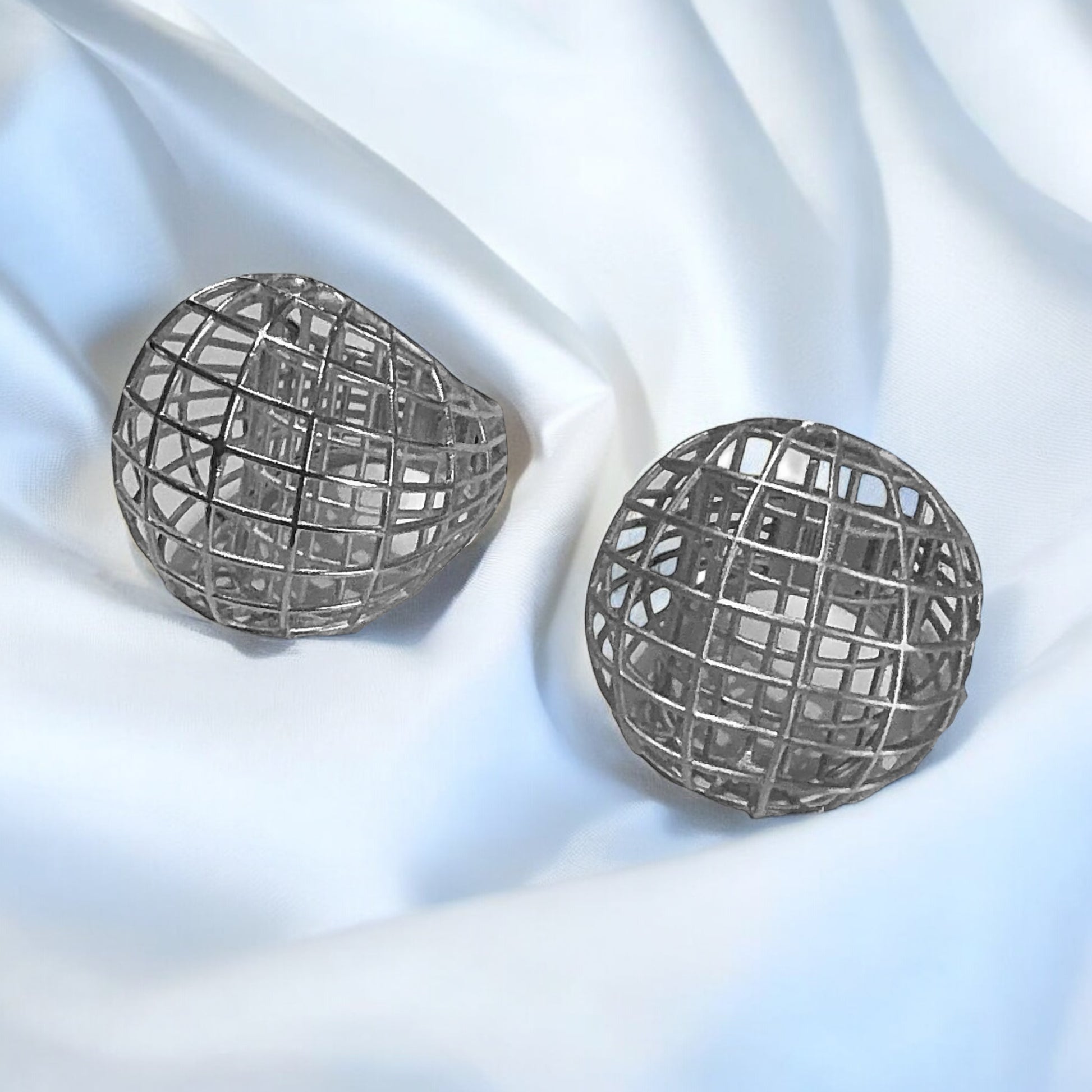 Arquitetura em miniatura. O anel Aramado traz volumes geométricos em repetição, criando uma textura urbana e futurista. Uma peça que fala a língua do design e da ousadia.