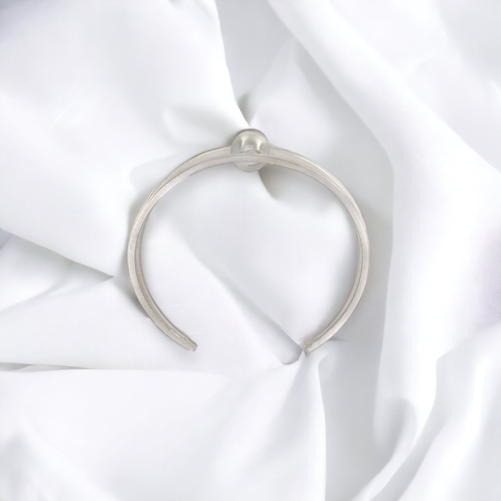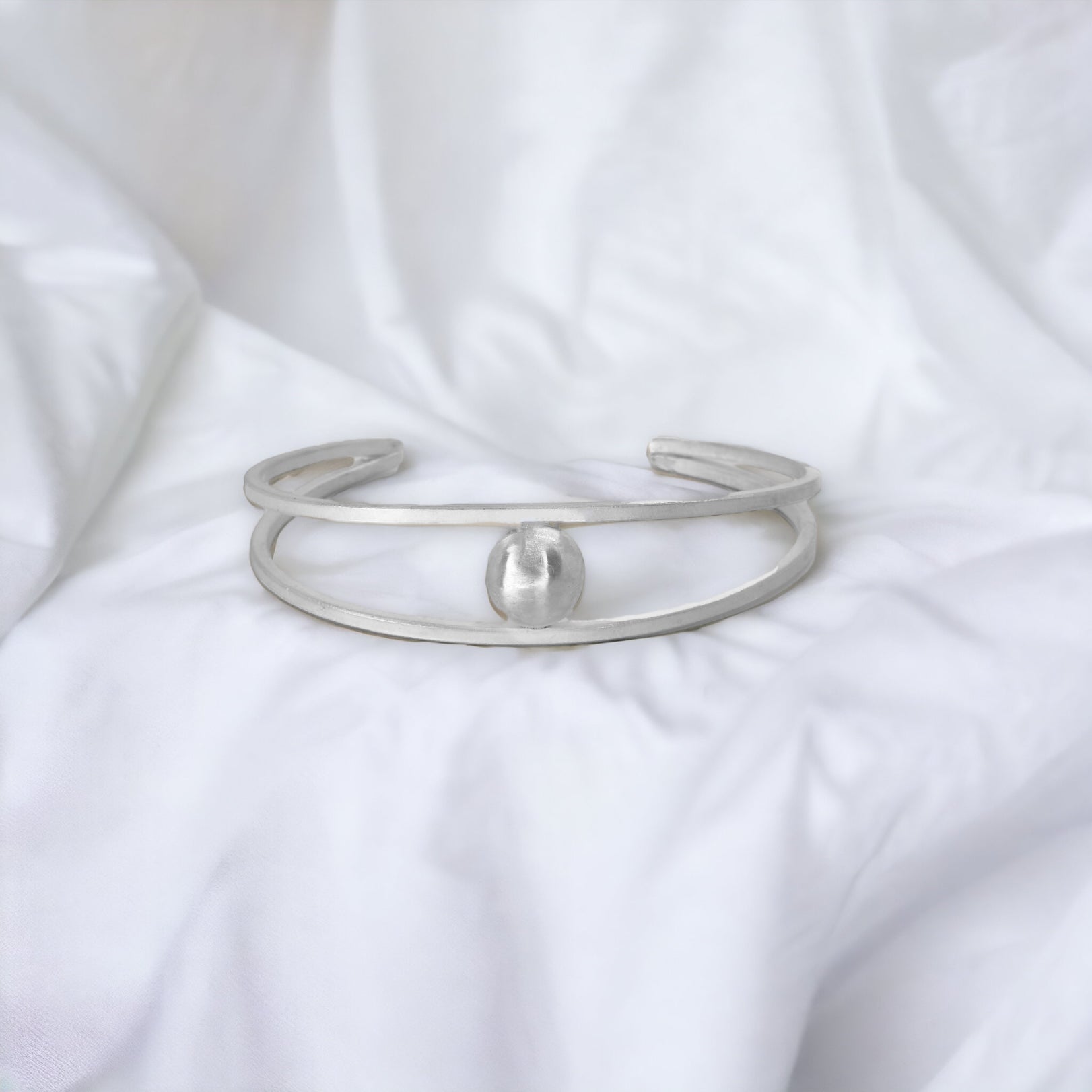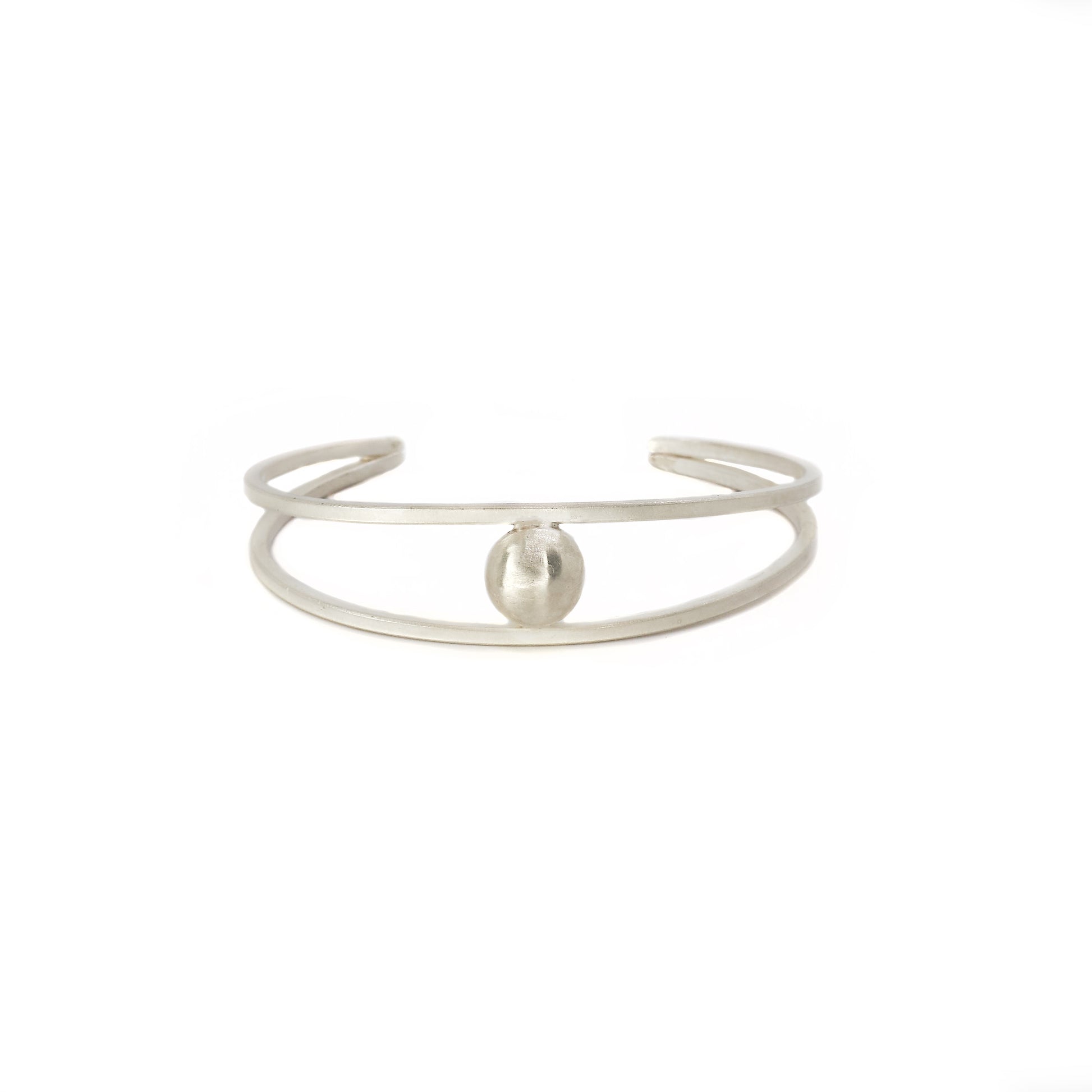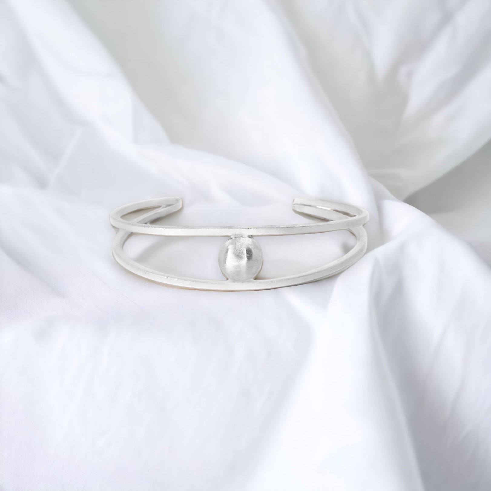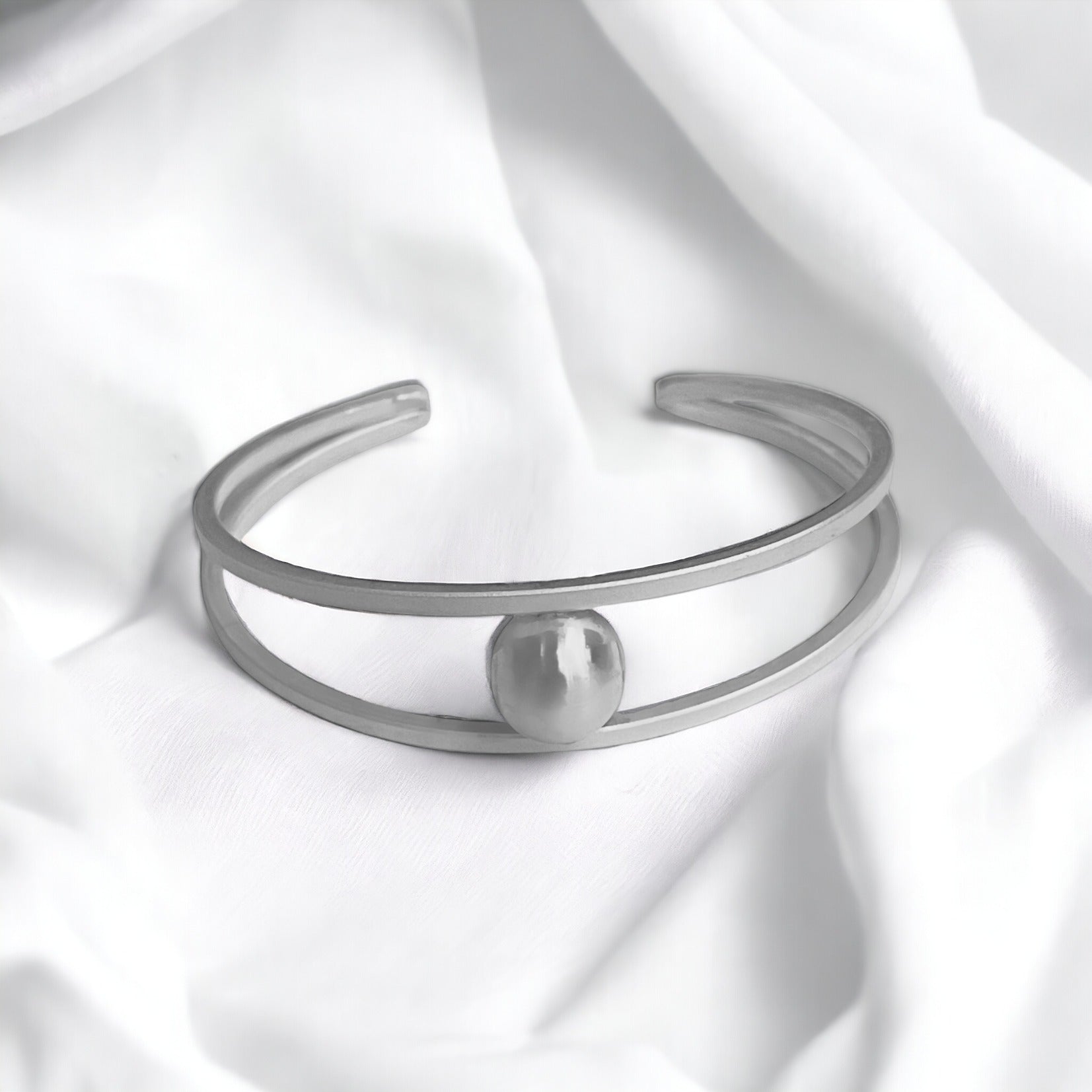 A pulseira Órbita traz a geometria do cosmos em forma de joia. Uma esfera em eterno movimento, rodeada por seu próprio universo. Minimalista e atemporal, é um lembrete de que cada um de nós carrega mundos dentro de si.
